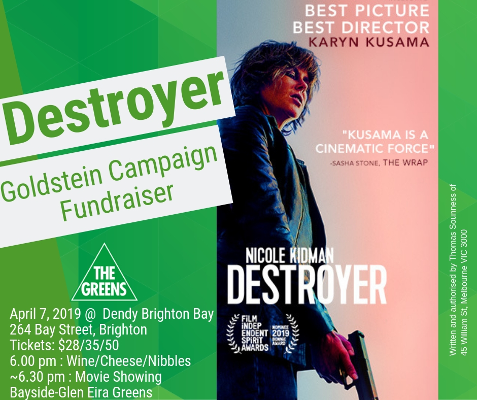 Join us for drinks and nibbles before seeing ‘Destroyer’, a film which follows the moral and existential odyssey of LAPD detective Erin Bell (astonishingly played by Nicole Kidman) when a fresh case exposes history from a former investigation. Proceeds to Bayside Glen Eira’s Goldstein campaign.