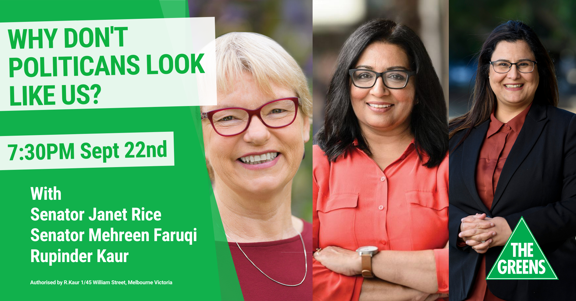 Join Wodonga Council candidate Rupinder Kaur and Senators Mehreen Faruqi & Janet Rice for a conversation about diversity in politics.